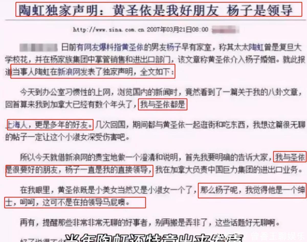 [免责声明]文章的时间、过程、图片均来自于网络,文章旨在传播正能量,均无低俗等不良引导,请观众勿对号入座,并上升到人身攻击等方面。观众理性看待本事件,切勿留下主观臆断的恶意评论,互联网不是法外之地。本文如若真实性存在争议、事件版权或图片侵权问题,请及时联系作者,我们将予以删除。信息来源:百度百科:黄圣依、陶虹、杨子个人资料黄圣依首次演话剧:我是从小在上海徐汇长大的孩子. 澎湃新闻. 2022-10-12[2023-03-29].黄圣依:有些经历和挣扎,是人生不可避免的. 新京报网. 2018-12-07[2023-03-29].杨子老婆陶虹近照曝光 美艳不输黄圣依.凤凰娱乐 [引用日期2015-03-21]